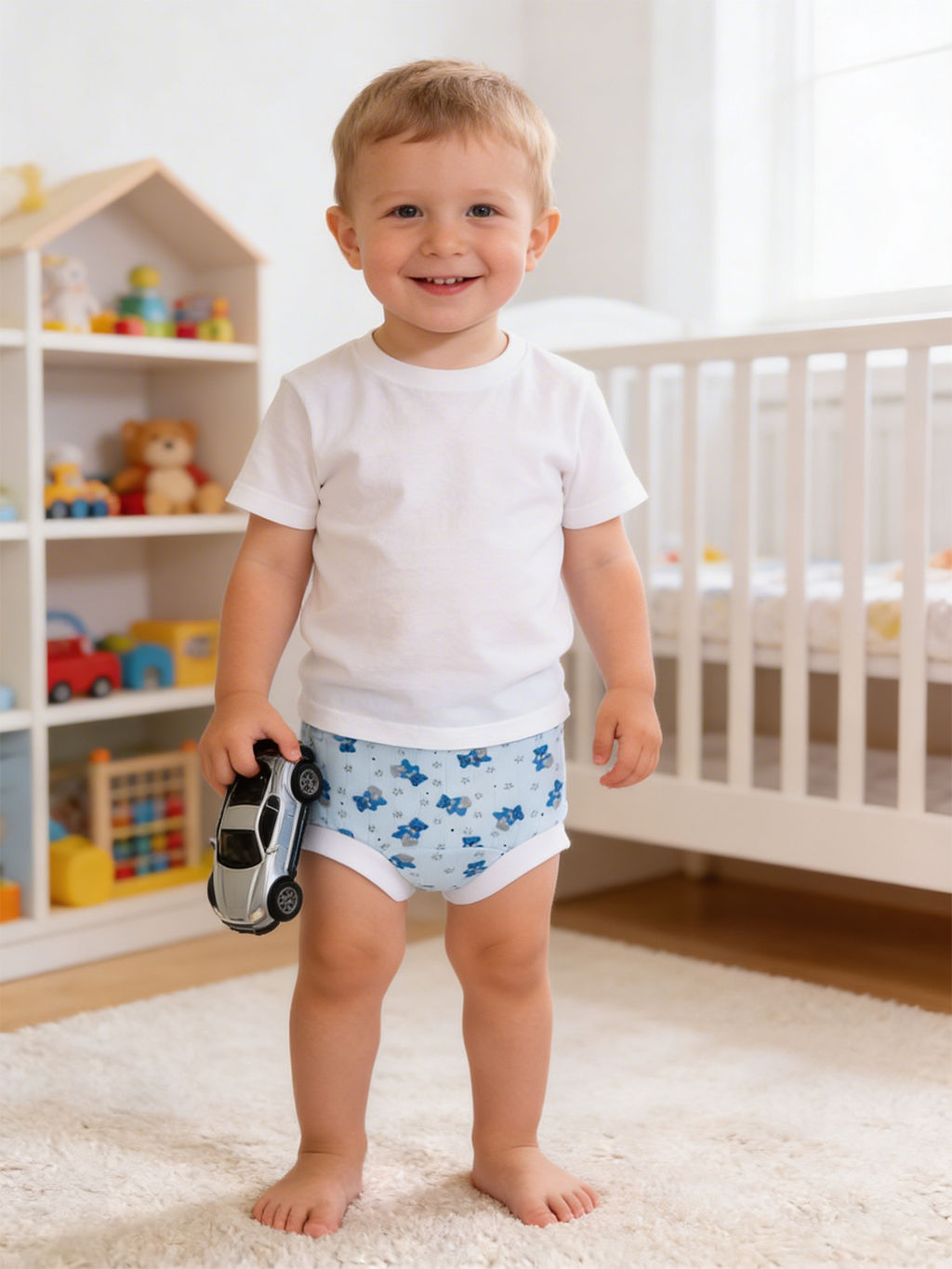 Повседневные трикотажные трусы. Манжеты на ножках. Пояс на резинке. Приятный к телу, практичный, прочный, хорошо переносящий стирку трикотаж голубого цвета с принтом мишки.