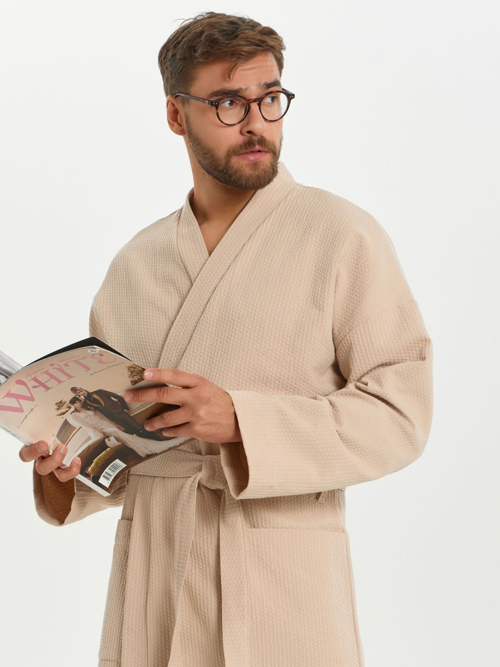 • Вафельный удлиненный халат Кимоно унисекс "Ромбы" бежевый В-14 (31)