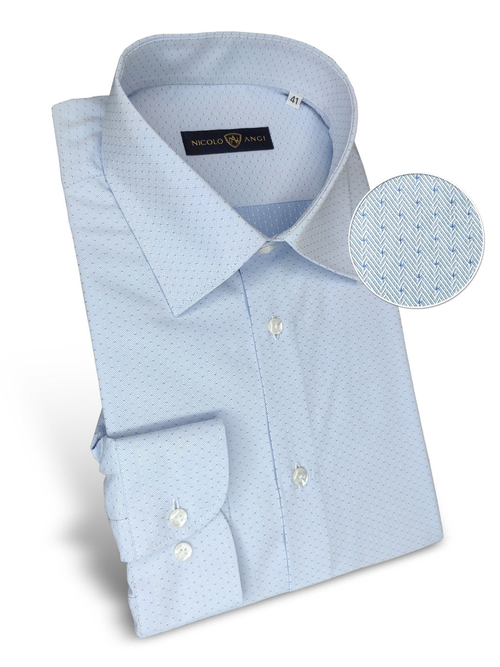 Классическая рубашка прямого кроя из однотонной жаккардовой ткани голубого цвета с длинным рукавом. Благородство ткани подчеркивается изящным рисунком полотна. Рубашка подходит как как для торжественных случаев, так и для повседневного использования.