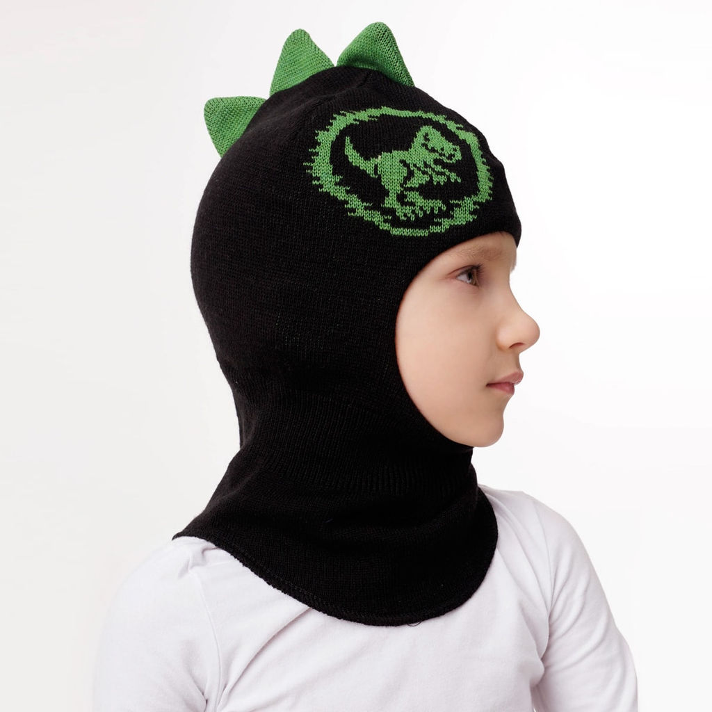 Шапка-шлем с изображением динозаврика. Верхний слой связан из полушерстяной пряжи; нижний изготовлен из трикотажного х/б полотна и полностью пришит. Сверху гребешок, сбоку вывязан рисунок динозавра.