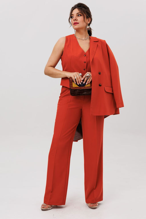 Состав: Костюм: Вискоза-68%; ПЭ-28%; Спандекс-4%; Подкладка: Вискоза-60%; ПЭ-40%; Этот костюм цвета пряный оранжевый - воплощение безупречного вкуса и современной женственности. Это не просто ансамбль, а капсула для вдохновения: двубортный жакет свободного прямого кроя с четкими лацканами и функциональными карманами задает тон уверенной элегантности. Особый шик этого образа скрыт в деталях - стоит расстегнуть жакет, и взгляд открывает благородную игру контрастов: цветная подкладка вспыхивает ярким акцентом, делая каждый жест выразительнее, а образ - объемнее и глубже. Полуприлегающий жилет с V-образным вырезом и регулируемым хлястиком на спинке мягко подчеркивает силуэт, а классические брюки с завышенной линией талии делают ноги бесконечно длинными. Каждая деталь здесь продумана до мелочей: качественная подкладка, благородная фактура однотонной ткани, идеальная посадка. Но главная магия этого костюма от Анелли - его универсальность. Носите его для деловых переговоров или торжественного выхода. Или же разлучайте их: жакет накинете на легкое платье, жилет составит компанию джинсам, а брюки станут идеальной парой для кашемирового свитера. Сочный, жизнерадостный цвет подарит вам хорошее настроение каждый день, превращая даже серые будни в праздник стиля. Замеры: Размер 42: Жакет: ОГ-96; ОТ-98; ОБ-100; ОП-32; ДИ-72; ДР-62; Жилет: ОГ-92; ОТ-78; ОБ-84; ДИ-46; Брюки (резинка растянута): ОТ-72; ОБ-100; ДИ-110; ширина по низу - 51; Размер 46: Жакет: ОГ-104; ОТ-106; ОБ-108; ОП-36; ДИ-73; ДР-62; Жилет: ОГ-100; ОТ-88; ОБ-94; ДИ-47; Брюки (резинка растянута): ОТ-78; ОБ-108; ДИ-110; ширина по низу - 52; Размер 48: Жакет: ОГ-108; ОТ-110; ОБ-112; ОП-38; ДИ-73; ДР-63; Жилет: ОГ-104; ОТ-94; ОБ-98; ДИ-48; Брюки (резинка растянута): ОТ-82; ОБ-112; ДИ-111; ширина по низу - 54; Размер 50: Жакет: ОГ-112; ОТ-114; ОБ-116; ОП-38; ДИ-73; ДР-63; Жилет: ОГ-108; ОТ-98; ОБ-102; ДИ-49; Брюки (резинка растянута): ОТ-86; ОБ-116; ДИ-111; ширина по низу - 54; -- Характеристики -- Состав: Костюм- Вискоза-68%; ПЭ-28%; Спандекс-4%; Подкладка- Вискоза-60%; ПЭ-40%; Сезон: Весна Рост: 170 Страна бренда: Беларусь