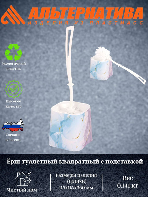 Изделие изготовлено из современного полимерного материала.  В комплект входит ёрш и подставка,которая позволяет сохранять чистоту и эстетичный вид. Оригинальность изделию придает яркий принт на  подставке и квадратная форма.