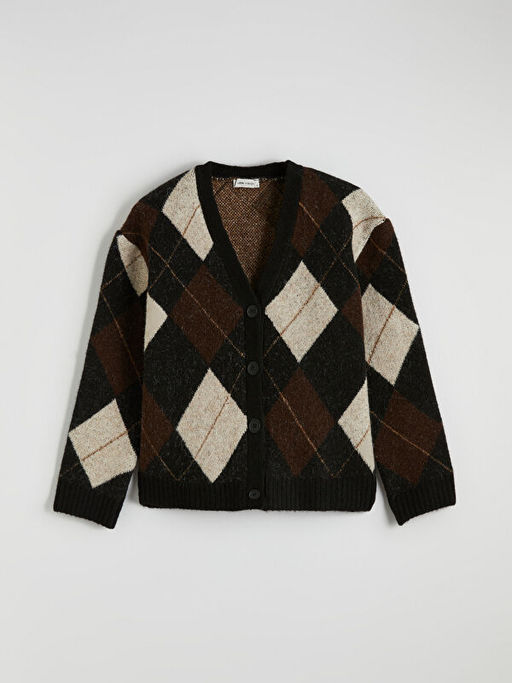 • V Yaka Baklava Desenli Oversize Kad?n Triko H?rka