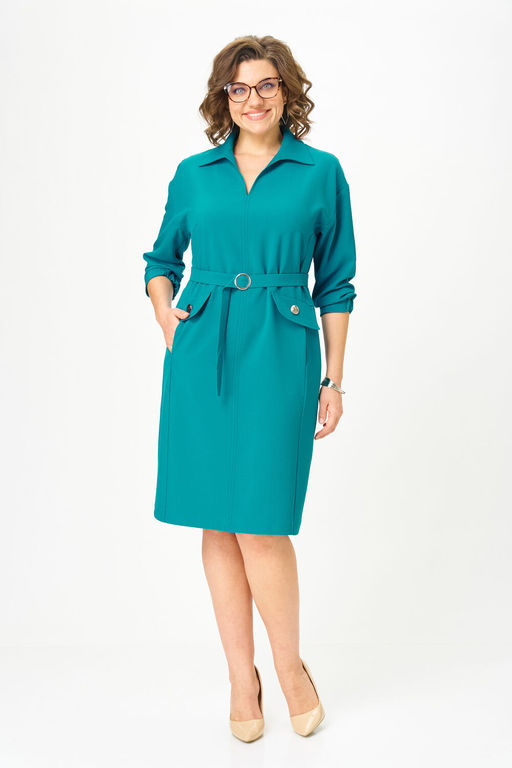 По переду центральный шов, сверху переходящий в вырез, а так же бочок из проймы, с нагрудной вытачкой, с карманами в шве в нижней части платья. Над карманом пришит клапан с декоративной пуговицей. Воротник стояче-отложной. Спинка со средним швом, снизу заканчивающимся разрезом. Рукав рубашечного покроя, одношовный, длиной 7/8, к низу притачивается манжета на половину собранная на резинку. К платью прилагается съемный пояс с отделочной пряжкой.