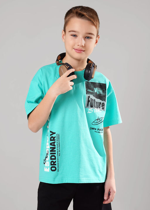 Хлопковая футболка в трендовом оттенке для подростка на каждый день! Эластичная горловина, яркий стильный принт спереди и на спинке. Сочетай футболку с брюками и шортами из новой коллекци и будь в тренде! 100% Хлопок