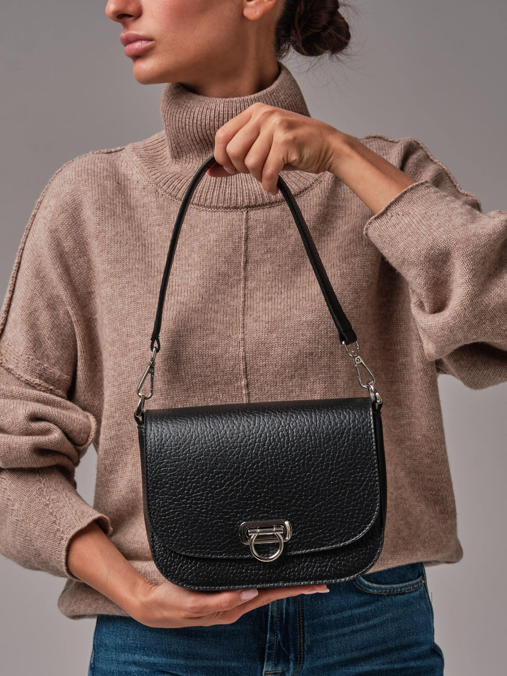 Эта женская сумка выглядит очень актуально: лаконичный дизайн, плавные линии, аккуратный клапан с декоративной пряжкой - всё это делает ее универсальной. Черный цвет легко вписывается в любой гардероб и сочетается как с теплыми, так и с холодными тонами.