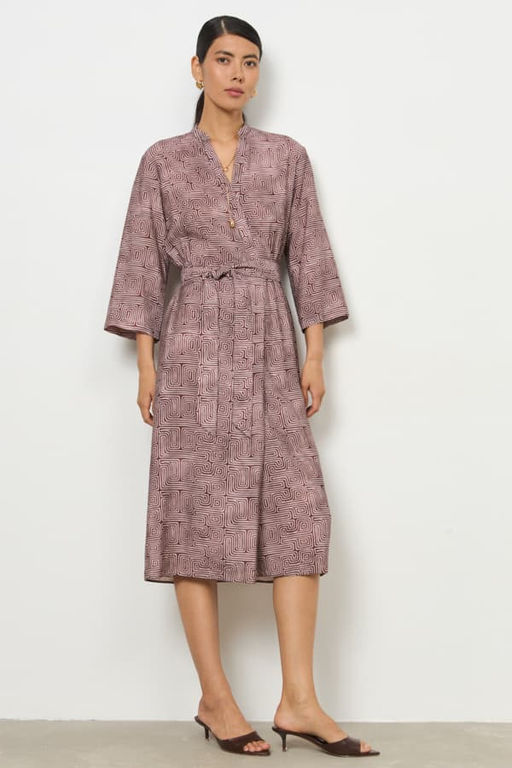Платье из вискозной ткани свободного силуэта. Изделие отрезное по линии талии с резинкой. Лиф платья с запахом, фиксируется на пуговицу для удобства. На передней части юбки выполнена складка, имитирующая запах, в боковых швах карманы. Линия горловины оформлена воротником-стойкой. Втачной длинный рукав. В комплекте пояс из основной ткани.
