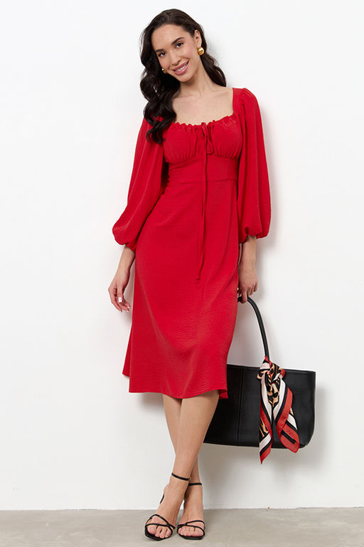 Платье приталенного силуэта, расширенное книзу из ткани с крэш-эффектом. Отрезное по линии талии. Верхняя часть с отрезным лифом, подрез фигурный. По верхнему краю лифа кулиска, в которую вставлены бретели-завязки, формирующие драпировку. Вырез горловины глубокий, расширенный, по форме напоминающий каре, с вырезом до линии подреза. Прилегание платья создано за счет рельефов на деталях переда и вытачек на деталях верхней и нижней части спинки. В верхней части среднего шва спинки застежка на потайную молнию. Рукава втачные, длинные, со сборкой по окату и низу рукава. В подгибку низа рукава вставлена резинка.