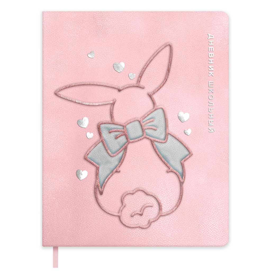 Дневник школьный арт. 72446 / 15 КРОЛИК С БАНТОМ (кожзам: А5+; твёрдый переплёт с поролоном, материал обложки: искусственная кожа "Лайка"; декор: аппликация из искусственной кожи, вышивка, тиснение фольгой; способ крепления блока: ниткошвейный; вн. блок: 48 л., белый офсет 80 г/м?, печать в одну краску, справочный материал: универсальная шпаргалка; отделка среза: окрашивание пантоном; закладка: одно ляссе; форзац: печать в одну краску;
