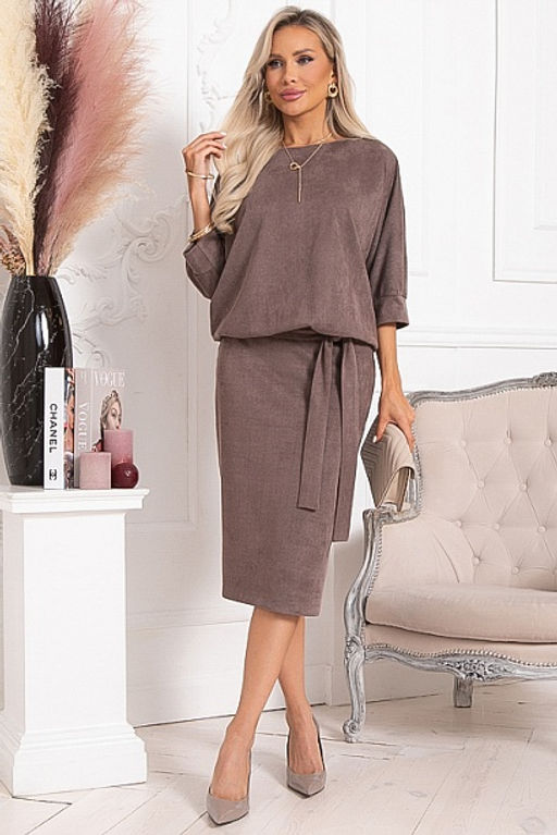 * Платье из трикотажного полотна под замшу.Лиф платья свободного силуэта,с цельнокроеными рукавами на манжете .Юбка прямая,слегка зауженная к низу,по спинке со шлицей.По талии платье зафиксировано на резину.Из верхней части платья формируется глубокий свободный напуск.Пояс из основной ткани в комплекте.