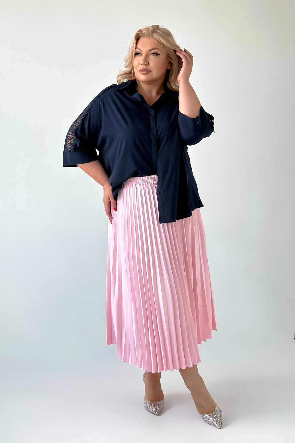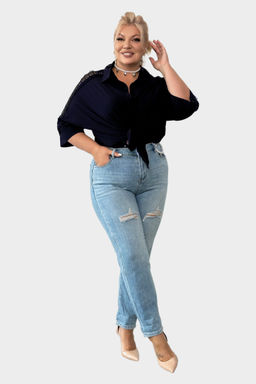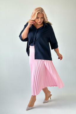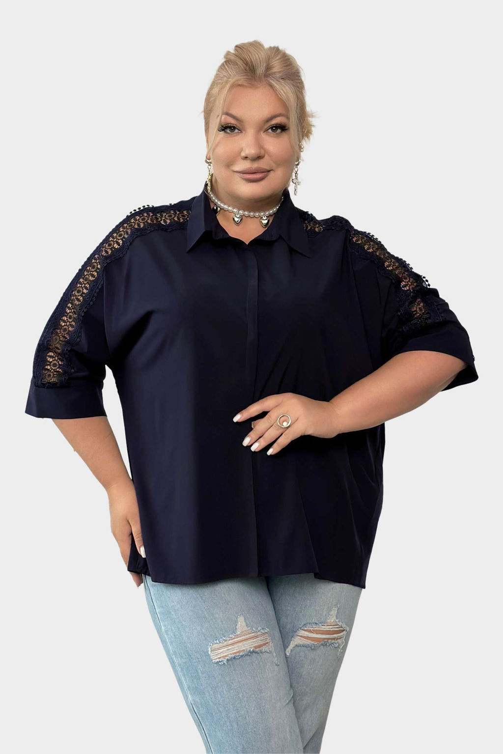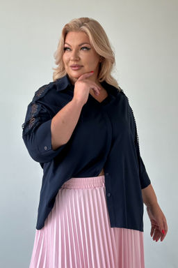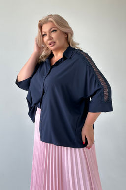 Рубашка свободный крой с кружевом на рукавах темно-синяя
