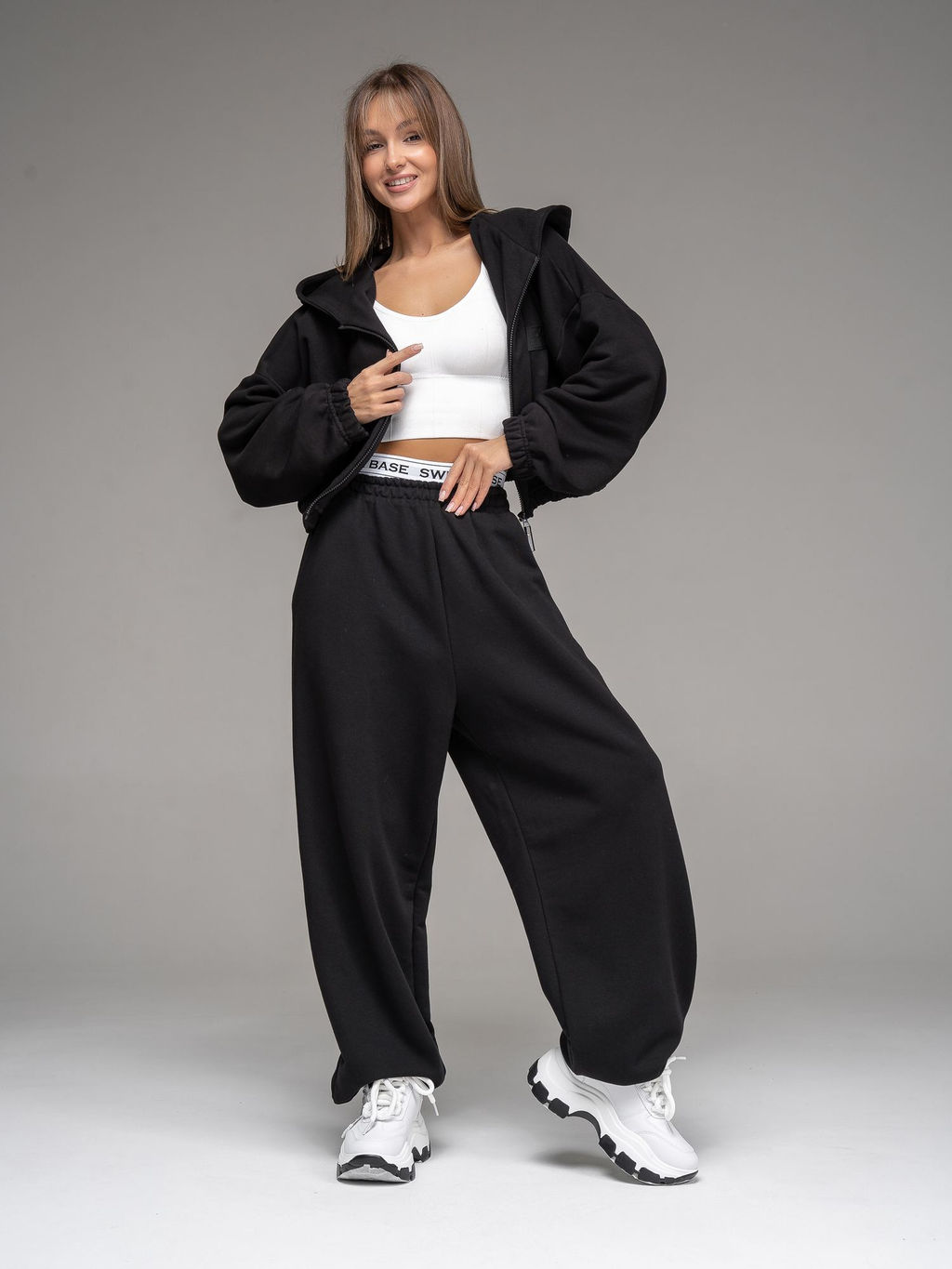 Женские брюки из футера с начесом черного цвета свободного силуэта с широким цельнокроенным поясом и боковыми карманами. По низу брюк - резинка. Изделие выполнено из трикотажа премиального качества - ПЕНЬЕ, с содержанием хлопка более 80%