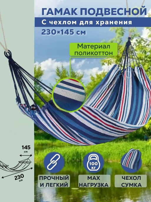 Полотняный гамак Ecos Ham-12. Предназначен для сидения, лежания и качания. Идеально подходит для загородного отдыха. В комплекте чехол для хранения и переноски. Гамак можно подвешивать на крючки в стенах, стволы деревьев, столбы и специальную подставку. Крючки, деревья, столбы и подставки должны быть прочны, чтобы выдержать достаточный вес. Размер полотна: 230x145см. Максимальная нагрузка: 100 кг.­
