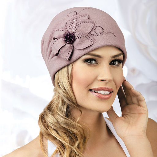Женская шерстяная шапка-бандана с драпировкой складок сзади, придающими объем. Сбоку украшена стилизованным цветком из основного полотна, серцевину которого украшает гроздь бусин в тон изделия. Дополняет композицию орнамент из страз.