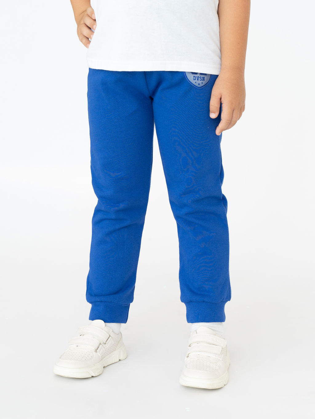 Детские спортивные брюки свободного кроя из футера с лайкрой. Петельчатая изнанка. Брюки на поясе с резинкой, по низу штанин мягкие манжеты. Подходят мальчикам и девочкам для дома, занятий спортом и прогулок. Спереди небольшой принт в виде эмблемы.
