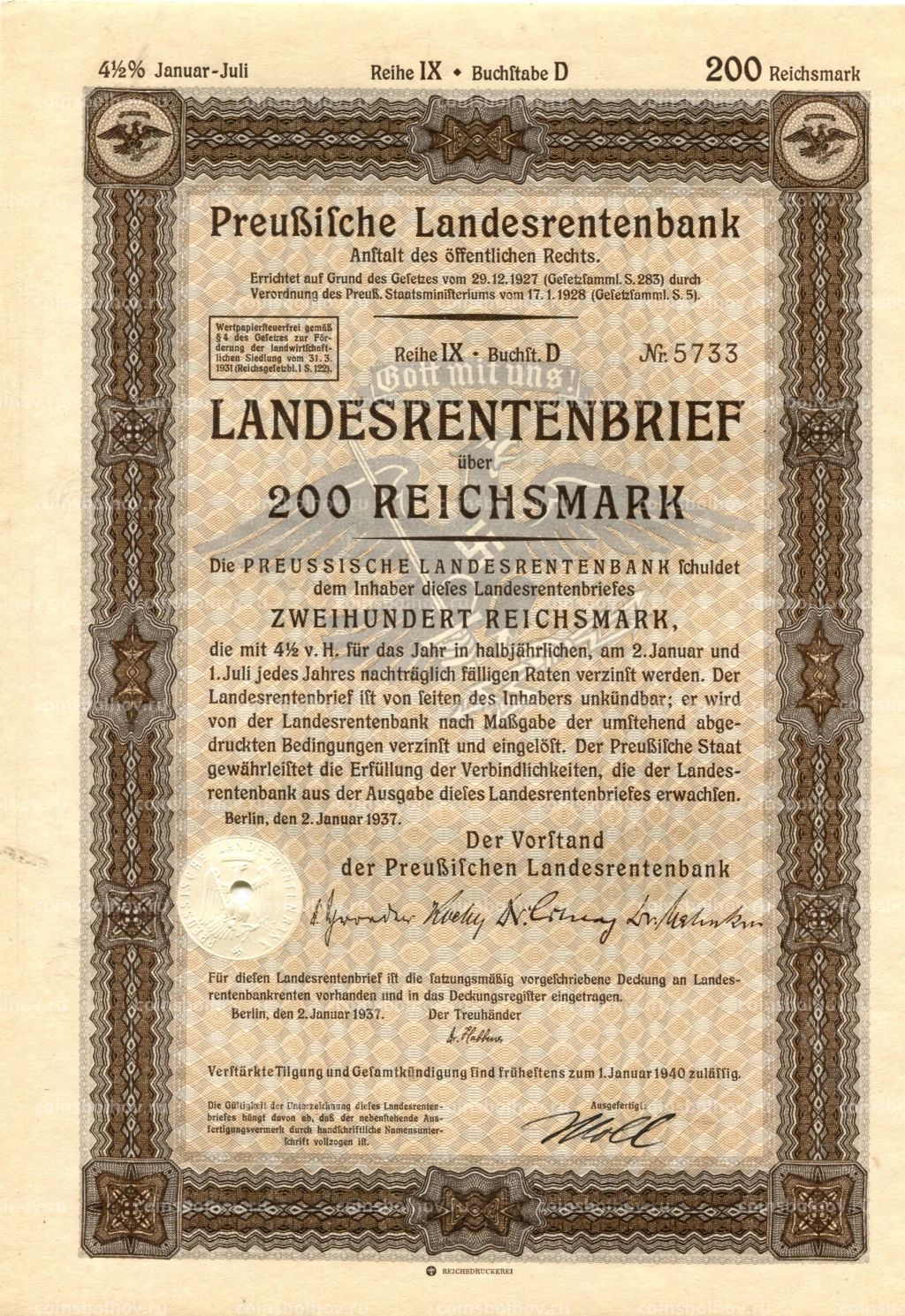 • Облигация 4,5% 200 рейхсмарок 1937 года Германия