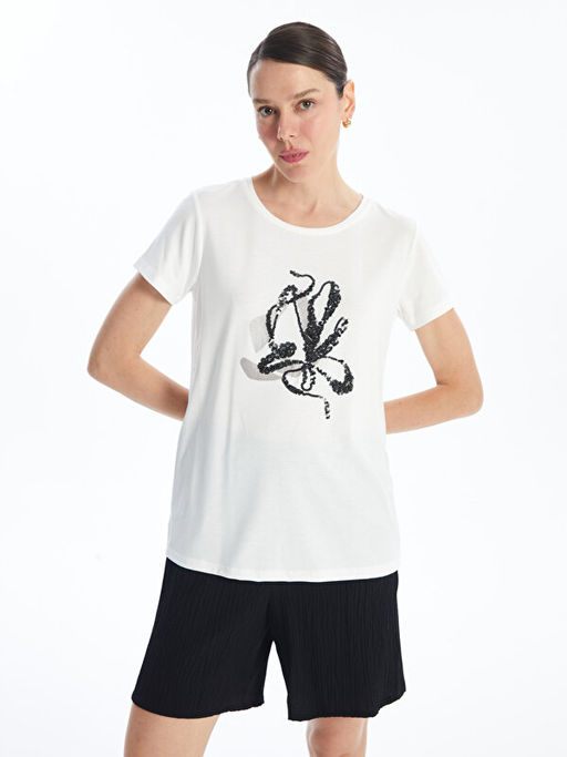• Bisiklet Yaka ??lemeli K?sa Kollu Kad?n Ti??rt