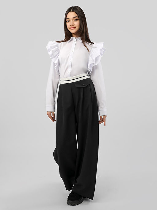 Брюки для девочки Соль&Перец. Модель имеет расширяющийся от бедра силуэт, что визуально вытягивает фигуру. Брюки с карманами, сзади в пояс вшита резинка. Брюки прекрасно сочетаются с любым верхом, и подойдут для любого мероприятия, подчеркнут индивидуальный стиль девочки, и разнообразят её школьный образ.