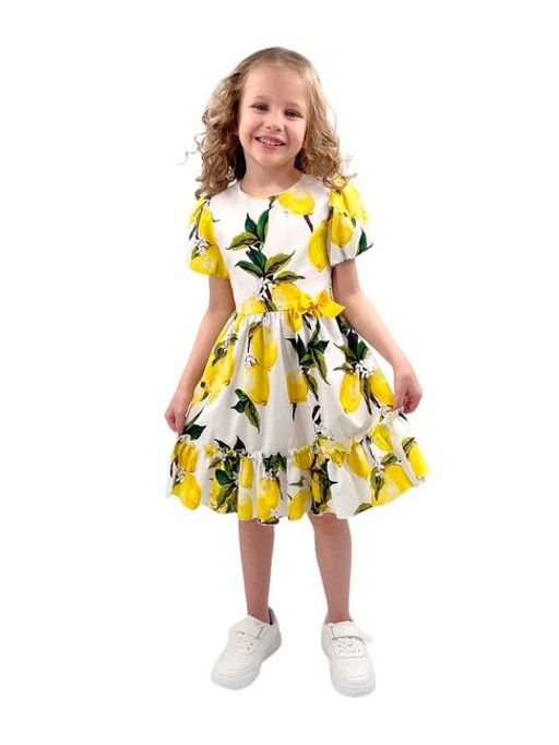 Платье из тонкого хлопка с дизайнерским принтом, завышенная отрезная линия талии, юбка со сборкой, к низу изделия притачивается оборка, короткие рукава со сборкой, на полочке украшение в виде бантика, на спинке застежка: разрез на пуговицу, полупояса.