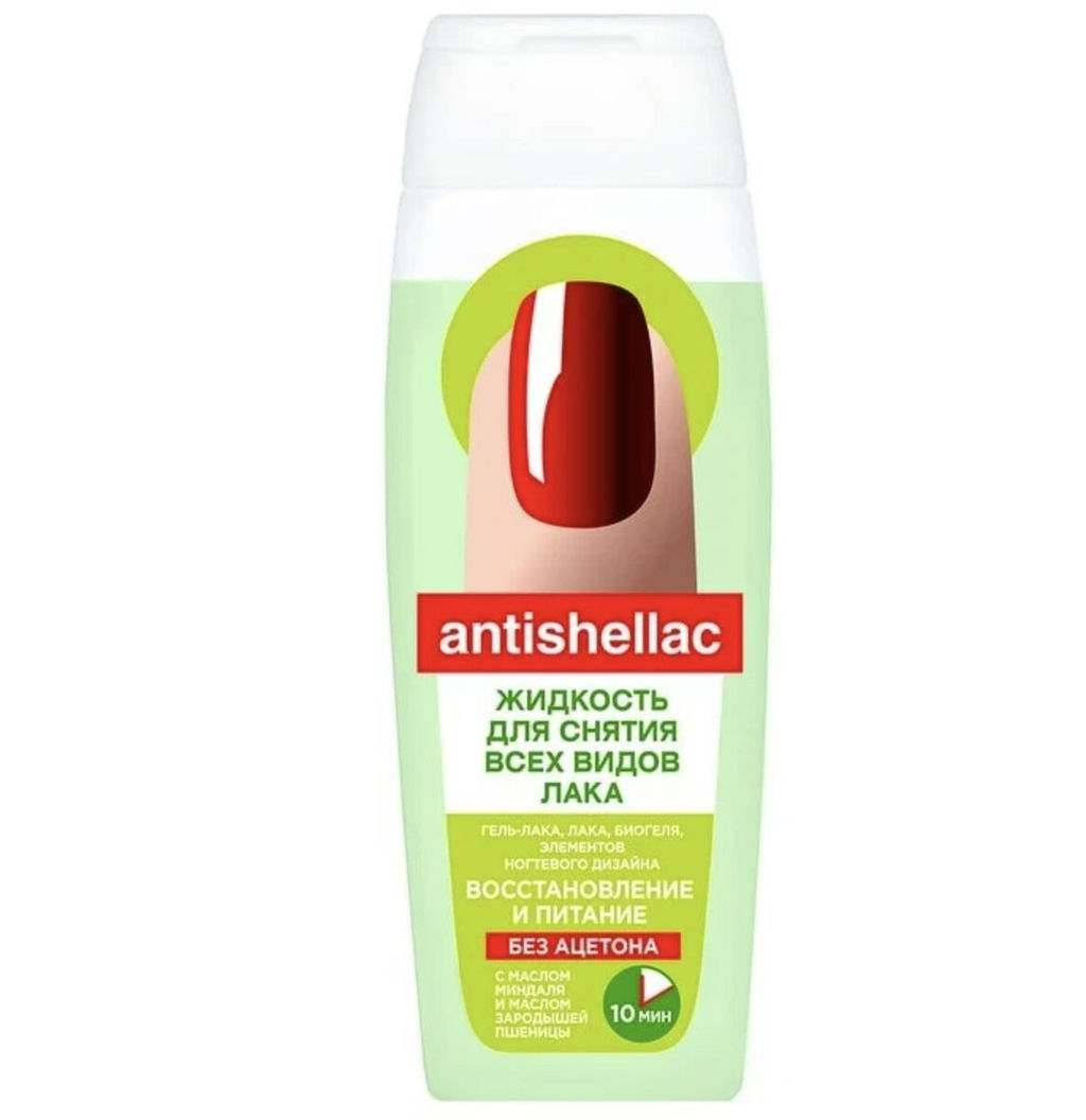 ANTISHELLAC Жидкость для снятия гель-лака Восстановление и Питание 110 мл. ФИТОкосметик. Жидкость для снятия гель - лака antishellac с маслом миндаля и маслом зародышей пшеницы. Восстановление и питание, быстрый эффект для поврежденных ногтей, без ацетона. Средство для самостоятельного удаления гель-лака в домашних условиях. Эффективно для снятия всех видов лака, shellac, гель - лака, акрила, биогеля, LED геля, удаления частиц клея, типс и элементов ногтевого дизайна, страз, бульонок, блесток и слюды. Комплекс эффективных для ухода за ногтями масел питает и восстанавливает тонкие, поврежденные в результате внешнего воздействия, ногти. Ногти становятся крепкими и здоровыми. Способ применения: Для снятия обычного лака: нанесите жидкость на ватный диск, приложите к ногтю, удалите лак. Для снятия стойкого лака: смочите ватные диски, наложите их на ногти, оберните кончики пальцев фольгой на 10 минут, удалите гель - лак деревянной палочкой. После применения вымыть руки в проточной воде.