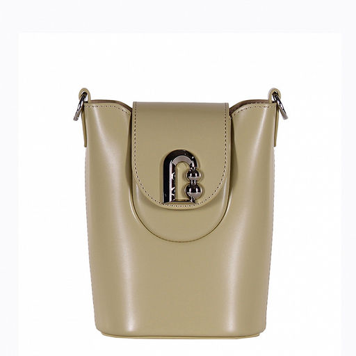 Модель в форме ведерка, выполнена из глянцевой натуральной кожи. Декорирована пряжкой на передней части. Дополнена серебристой фурнитурой. Данная модель закрывается на клапан. Каркас жесткий. В комплекте съемный плетеный ремень с регулировкой длины, крепится за карабины.