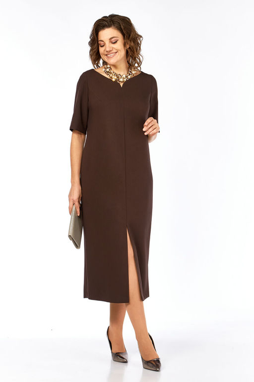 Платье женское, полуприлегающего силуэта, выполнено из плательно-костюмной ткани. Горловина фигурной формы. Перед с нагрудными вытачками и средним швом в котором обработан разрез. Спинка со средним швом. Рукава втачные, одношовные с небольшим разрезом по шву.