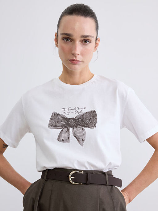 Bisiklet Yaka Fiyonk Bask?l? Kad?n Ti??rt