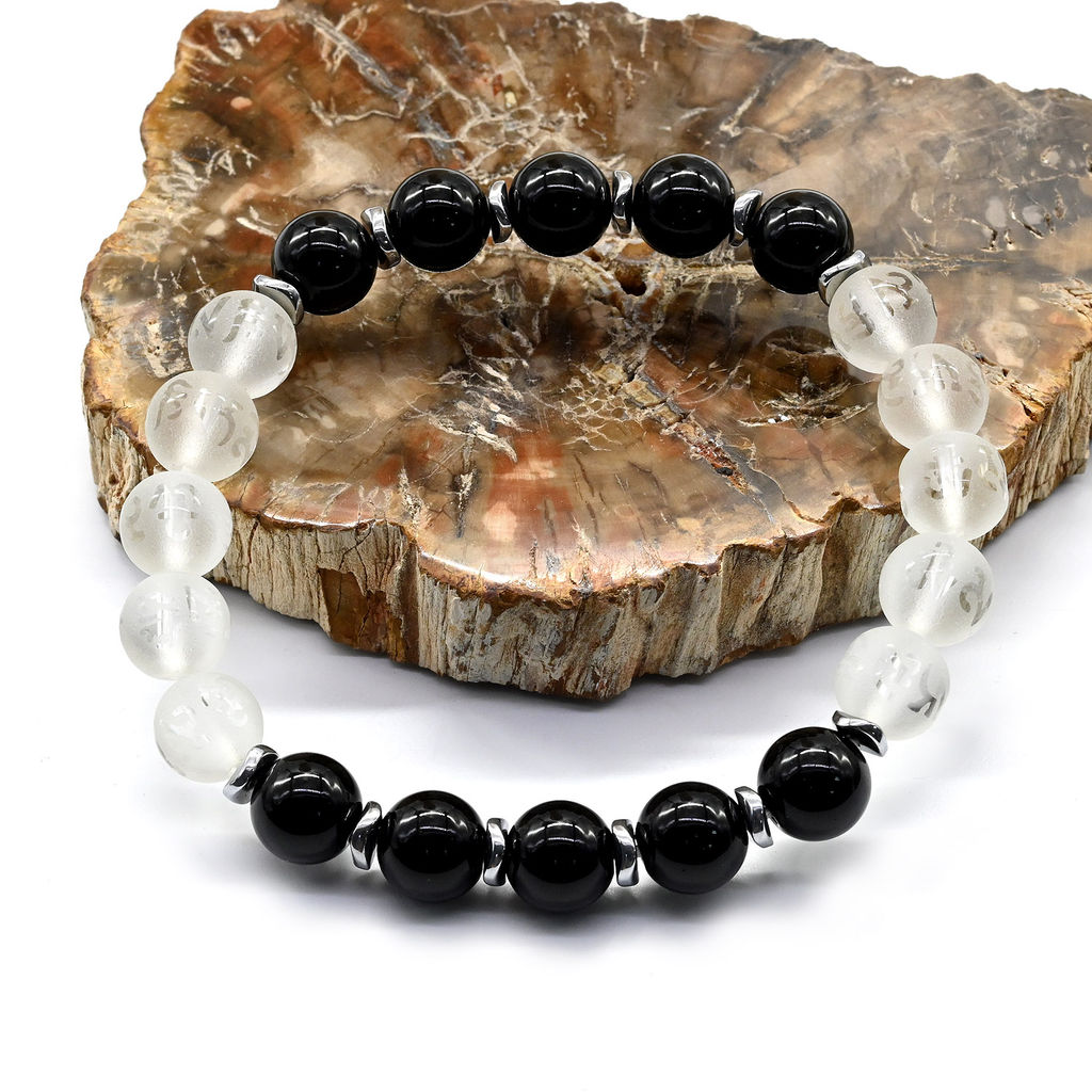 Мужской браслет с мантрой из агата черного и хрусталя шарик 10мм, 19см Радуга камня