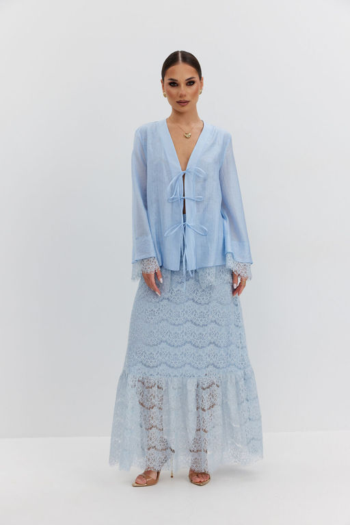 Юбка женская из кружевной ткани, имеет А-образный расширенный силуэт, с широким воланом со сборкой по низу, длина макси, юбка на подкладке. Верх юбки на поясе, со шлевками под ремень, застежка на потайную молнию по среднему шву сзади.  Длина 100 см.