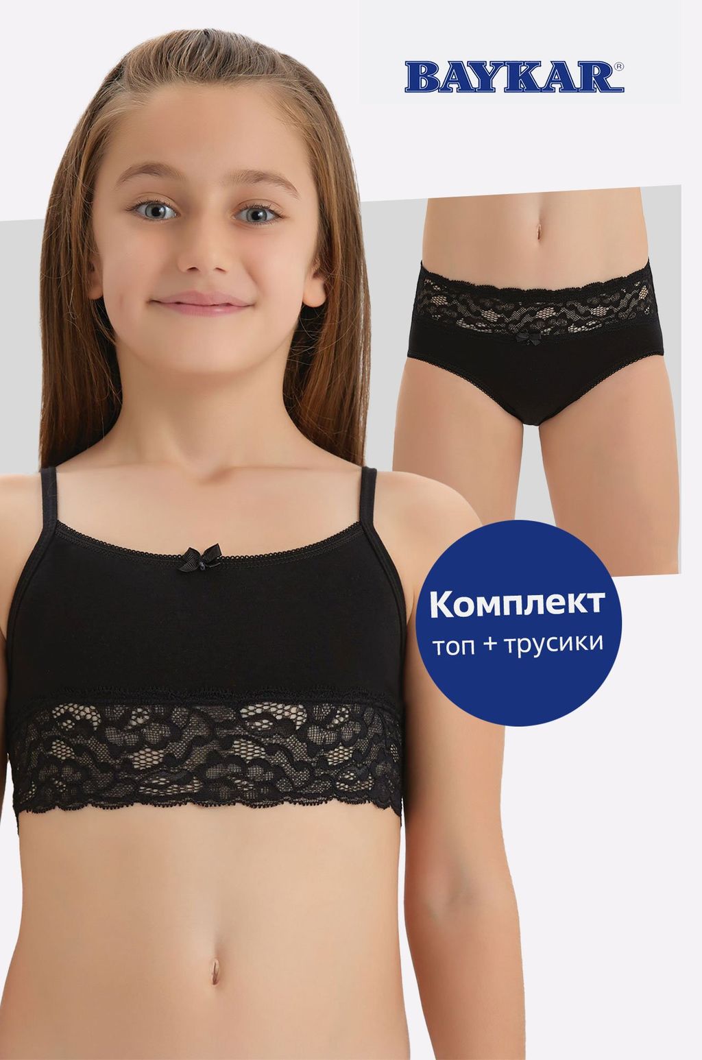 Состав: 95% хлопок, 5% эластан . Страна: Турция. Нежный однотонный комплект белья для девочки и девочки подростка выполнен из натурального хлопка с эластаном. Бельевой комплект черного цвета комфортно носить под любую одежду круглый год. В наборе майка топ для девочек и трусы в черном цвете. Комплект украшен эластичным и кружевом.