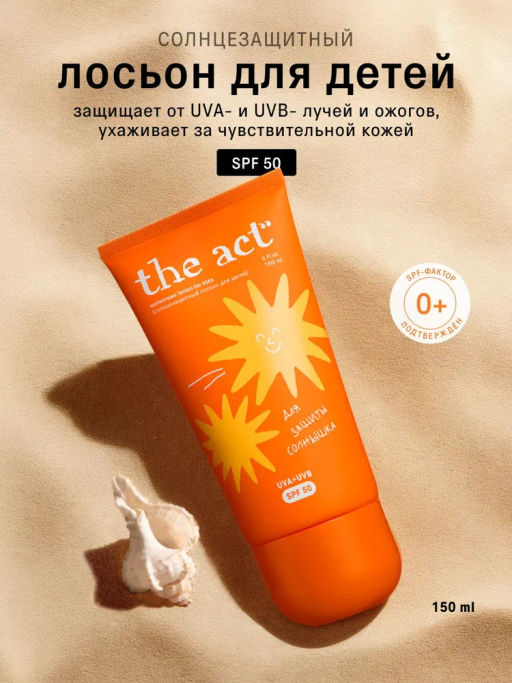 Описание товара Солнцезащитный лосьон для детей SPF 50 от The Act — это надёжная защита от солнца и мягкий уход для самых маленьких. Лёгкая текстура, как у комфортного молочка, равномерно наносится и не оставляет белых следов. Подходит для чувствительной кожи, не вызывает раздражения, не мешает игре и движению. Современные химические SPF-фильтры нового поколения эффективно блокируют UVA- и UVB-лучи, сохраняя кожу в безопасности даже в активные солнечные часы.