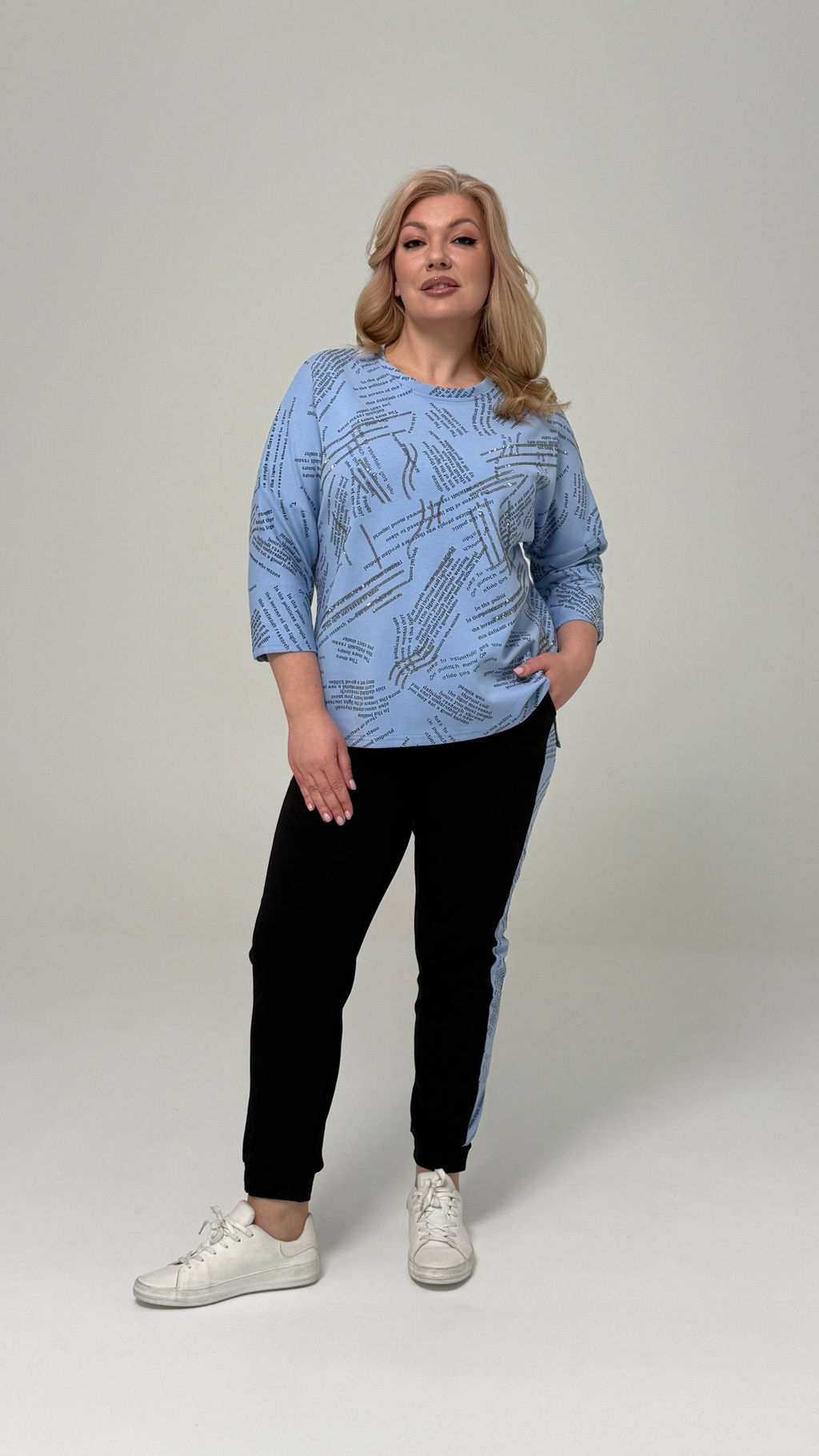 Туника с текстовым принтом и стразами голубой­