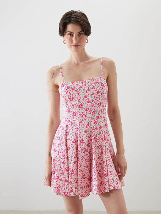 Kare Yaka ?i?ekli Modal Kar???ml? Mini Elbise