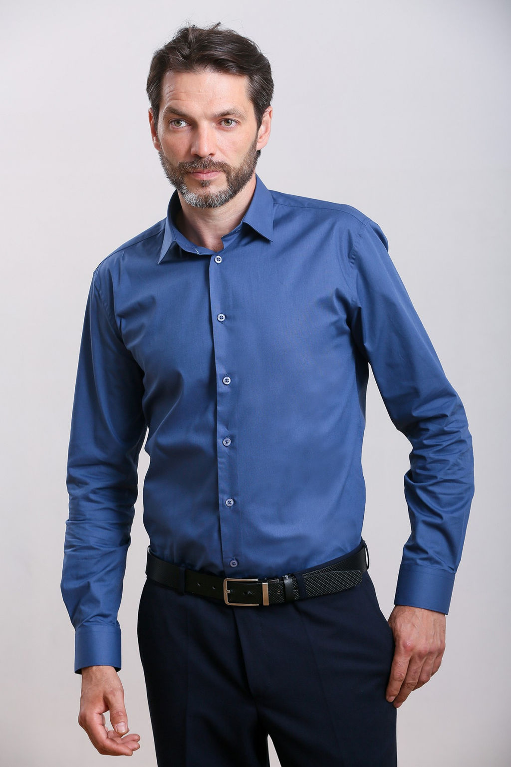 Рубашка классическая,однотонная из 100% хлопка,цвет джинс. Воротник классический,без кармана,длинный рукав, узкий манжет. Силуэт полуприталенный,под заправку. Стиль деловой. Носить можно с джинсами и с брюками в контраст к тону основной ткани.