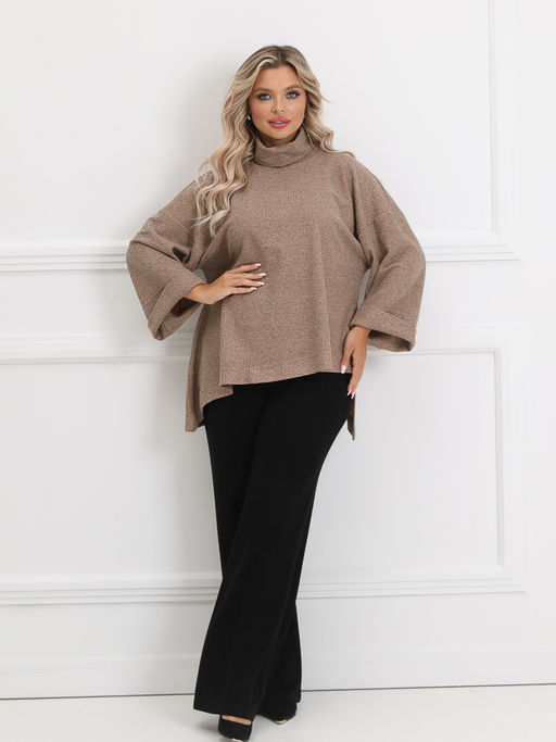 Стильный джемпер свободного силуэта из трикотажного полотна бежевого цвета. Круглый вырез изделия обработан воротником полустойка. Джемпер со спущенной проймой и втачными рукавами. Длина изделия по спинке от плечевого шва до низа изделия - 65 см. Рост фотомодели 170 см.­