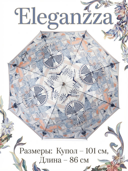 Женский зонт-трость, полуавтомат торговой марки ELEGANZZA. Материал купола: 100% полиэстер, сатин. Материал каркаса: сталь + фибергласс. Материал ручки: пластик. Длина изделия - 86 см. Диаметр купола - 101 см.