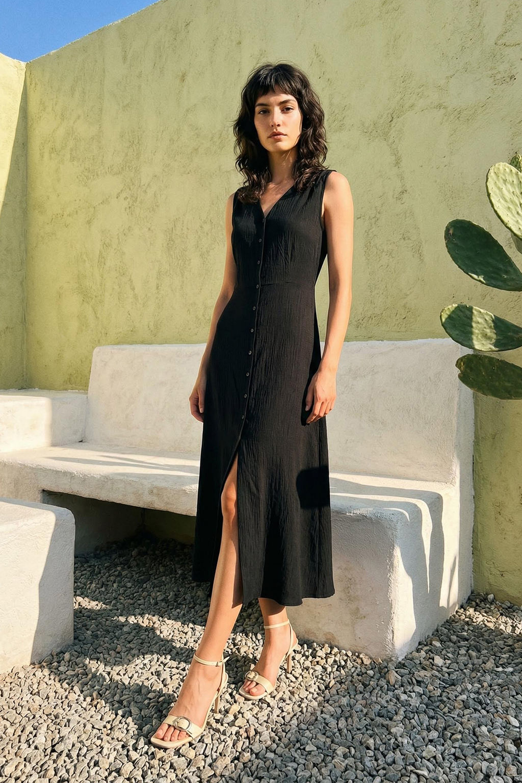 • Siyah Dugmeli Kolsuz Midi Dokuma Gomlek Elbise TWOSS24EL00442