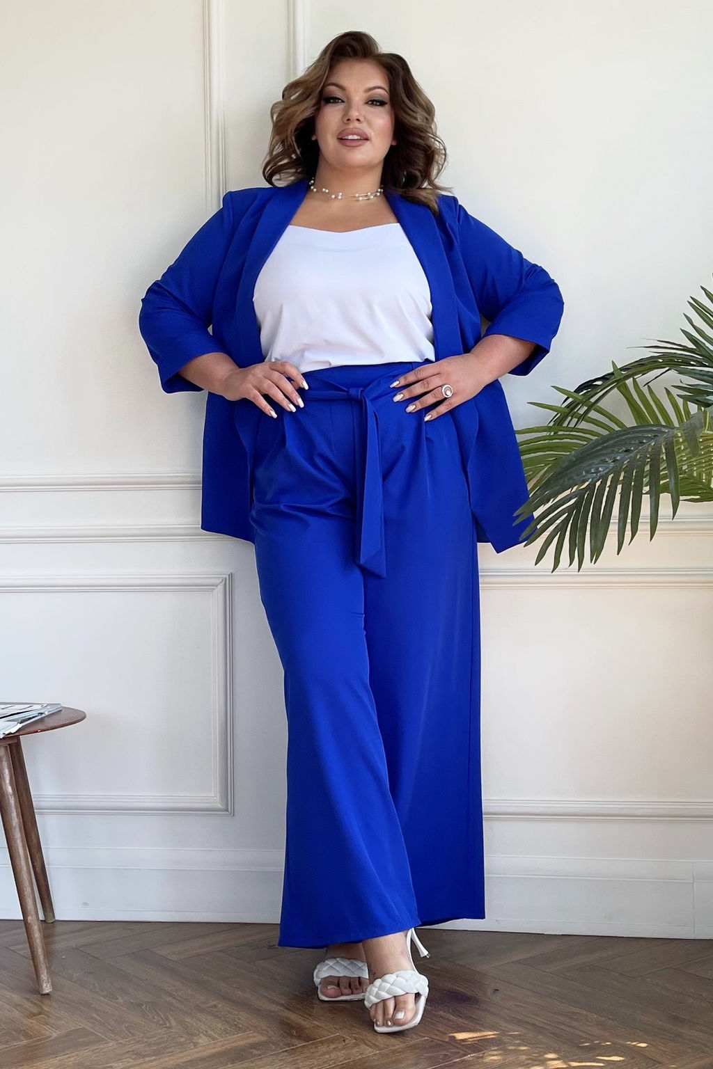 Костюм  из жакета  и брюк выполнен из мягкого струящегося материала.