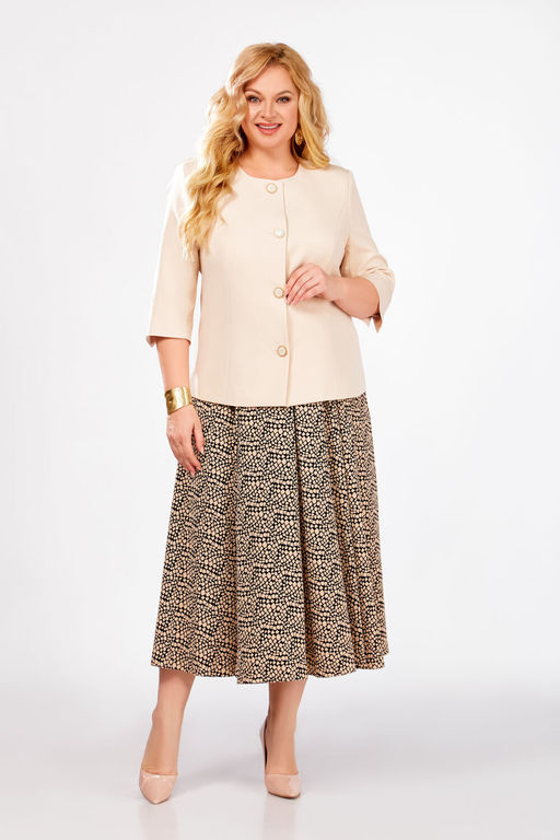 Состав: Жакет: Вискоза-34%; ПЭ-63%; Эластан-3%; Платье: Вискоза-60%; ПЭ-40%; Комплект 2-х предметный, состоящий из жакета однотон из поливискозной ткани и платья в принт из плательной вискозной ткани. Жакет однобортный на подкладке. По переду рельефы и отрезные бочки, по спинке - рельефы и средний шов. Горловина круглая. Рукав втачной двухшовный, длиной ?, внизу с разрезом. Застежка на 4 петли и 4 декоративные пуговицы. Длина жакета по спинке 60 (+/-1) см. Длина рукава 42 (+/-1) см. Платье из мягкой вискозной ткани, Х-образного силуэта с полуприлегающим лифом. Платье отрезное по линии талии. По переду лифа расположены рельефы, по спинке лифа талиевые вытачки. Юбка расклешённая из шести клиньев со встречными складками по линии талии. В среднем шве спинки застёжка на потайную тесьму-молнию. Рукав втачной, покроя тюльпан, длина рукава 15 см. В комплекте ремень с декоративной пряжкой. В 64р. в комплекте только съёмный пояс из основной ткани. Длина платья по спинке 120 см. -- Характеристики -- Состав: Жакет- Вискоза-34%; ПЭ-63%; Эластан-3%; Платье- Вискоза-60%; ПЭ-40%; Сезон: Весна-Лето Рост: 164 Страна бренда: Беларусь