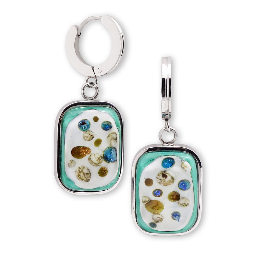 Серьги изготовлены из муранского стекла и гипоаллергенной ювелирной стали, что очень важно для людей с чувствительной кожей. Металл не темнеет и не подвергается воздействиям окружающей среды, надолго обеспечивая красивый внешний вид изделия. Длина серег - 4 см. Размер стеклянного элемента - 2х1,5 см.  Вес обеих серег - 9 гр.
