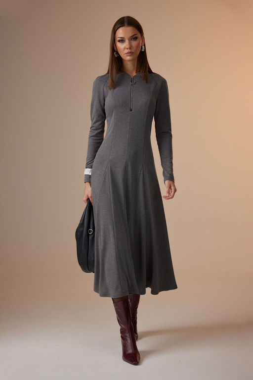 Платье женское полуприлегающего силуэта,  с рукавом покроя реглан. По центру переда шов, сверху в который вставлена отделочная молния. Так же по переду рельефы, проходящие через центр груди, в них вставлены широкие клинья, создающие драпировку по низу. По горловине пришита бейка из основной ткани. Спинка с двумя рельефами, в которые так же вставлены клинья. Рукав покроя реглан, длинный, зауженный к низу.
