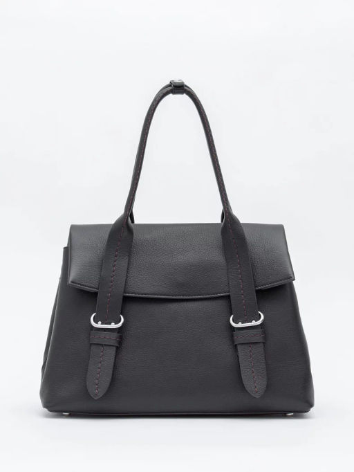 Классическая модель, выполнена из натуральной кожи. Дополнена серебристой фурнитурой. Данная модель закрывается на клапан. Каркас полужесткий. Сумка носится в руке или на плече за удлиненные встроенные ручки с фиксатором. На дне предусмотрены ножки.