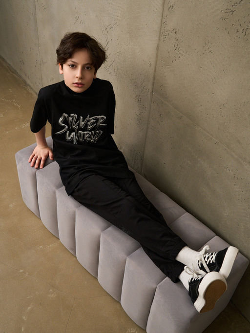 Брюки "Джоггеры"для мальчика из премиального качественного хлопкового пенье футера 2-х нитки, зауженные, со стрелками и карманами в швах с бочками. Пояс 2-х цветный на резинке, регулируется шнуром. Низ брюк собранны на резинку. Декор принт. Состав:92% хлопок, 8% лайкра