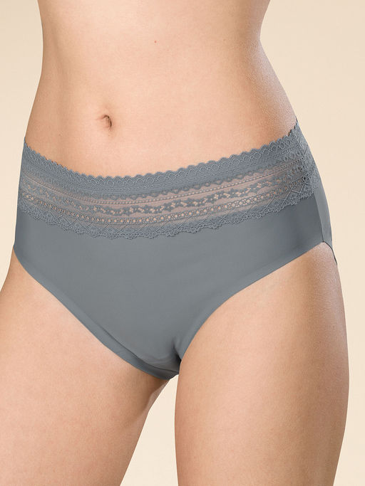 Женские трусы-слипы с высокой посадкой. Изготовлены по бесшовной технологии с минимум швов. Кромки по ноге и по талии подогнуты и приклеены, хлопковая приклеенная ластовица. Нежное геометричное кружево по линии талии высотой 5 см не передавливает тело и не натирает кожу. Модель оценят те, кто ищет незаметное и невесомое белье на каждый день или особого случая.