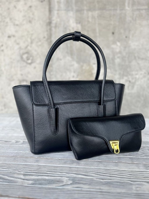 Женская сумка из натуральной кожи черного цвета, 2 в 1, с клатчем в комплекте.