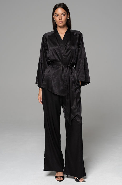 Комплект-тройка Mia-Amore состоит из топа на тонких бретелях, широких брюк и запашного жакета. Изделия комплекта выполнены из смесового шелкового жаккардового полотна. В комплекте широкий пояс. Состав:70% натуральный шелк, 25% полиэстер, 5% эластан