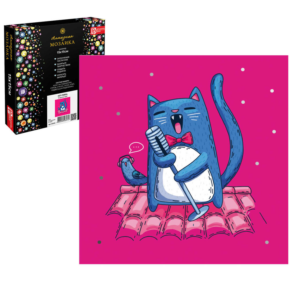 Набор для творчества Алмазная мозаика с частичной выкладкой арт. 65599 / 25 КОТ-ПЕВЕЦ, размер: 15*15 см, (10 цветов страз, холст на подрамнике с напечатанной картиной, покрытый клеевым слоем и защитной пленкой, пакеты со стразами, стилус, лоток для страз, силикон для страз, клей, подвесы для подрамника, пинцет металлический, схема, дополнительные пакеты с zip-молнией, стикеры для нумерации zip-пакетов в комплекте, форма страз: круглая, тип выкладки: частичная, картонная коробка с европодвесом)
