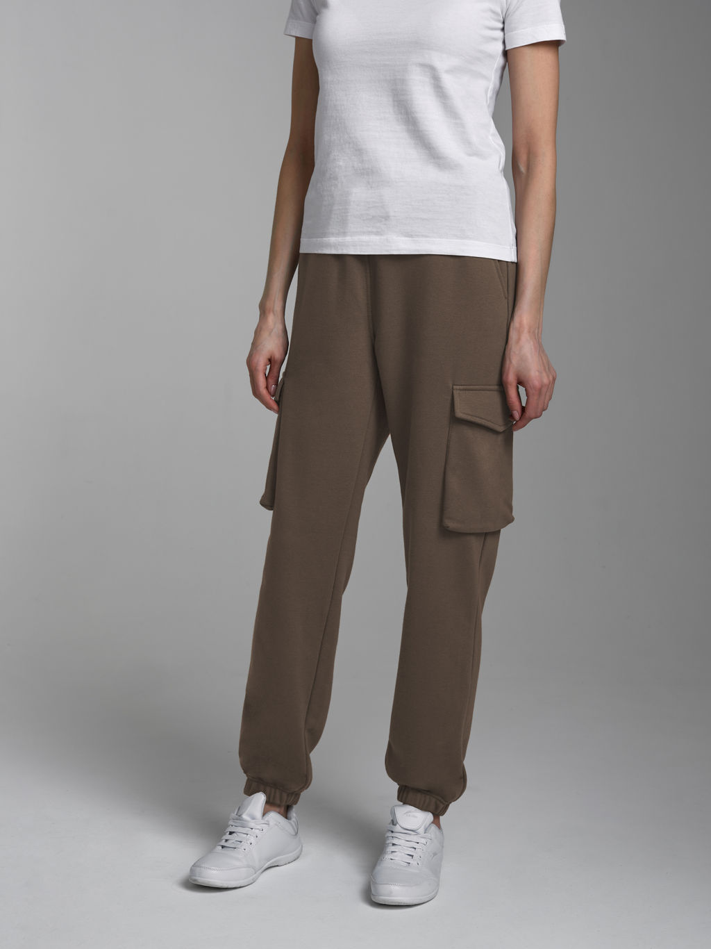 Брюки женские "Карго" из плотного хлопкового трикотажного полотна с петельной изнанкой. Карманы верхние прорезные с бочком. Есть дополнительные боковые накладные карманы, объемные, с клапанами. Низ брюк заужен и присобран на манжету с эластичной резиной. Пояс брюк дополнительно регулируется шнуром.