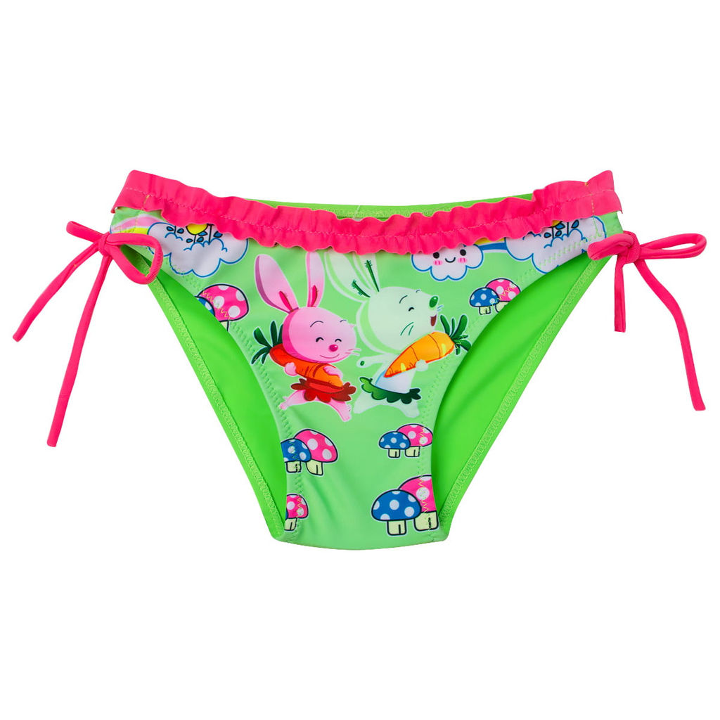 Яркие пляжные плавки для девочки. Модель с завязками по бокам, декорирована рюшами и симпатичным принтом. Отличный выбор для летнего отдыха.