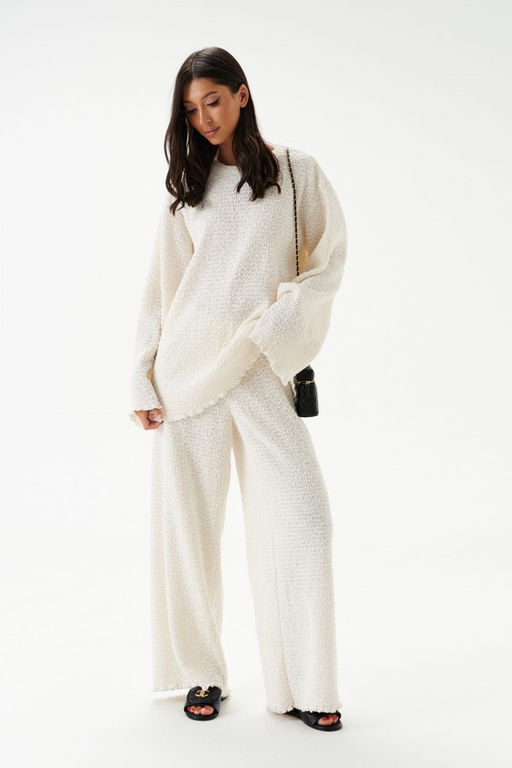 Брюки свободного кроя выполнены из полотна "букле-венгерка" молочного цвета.